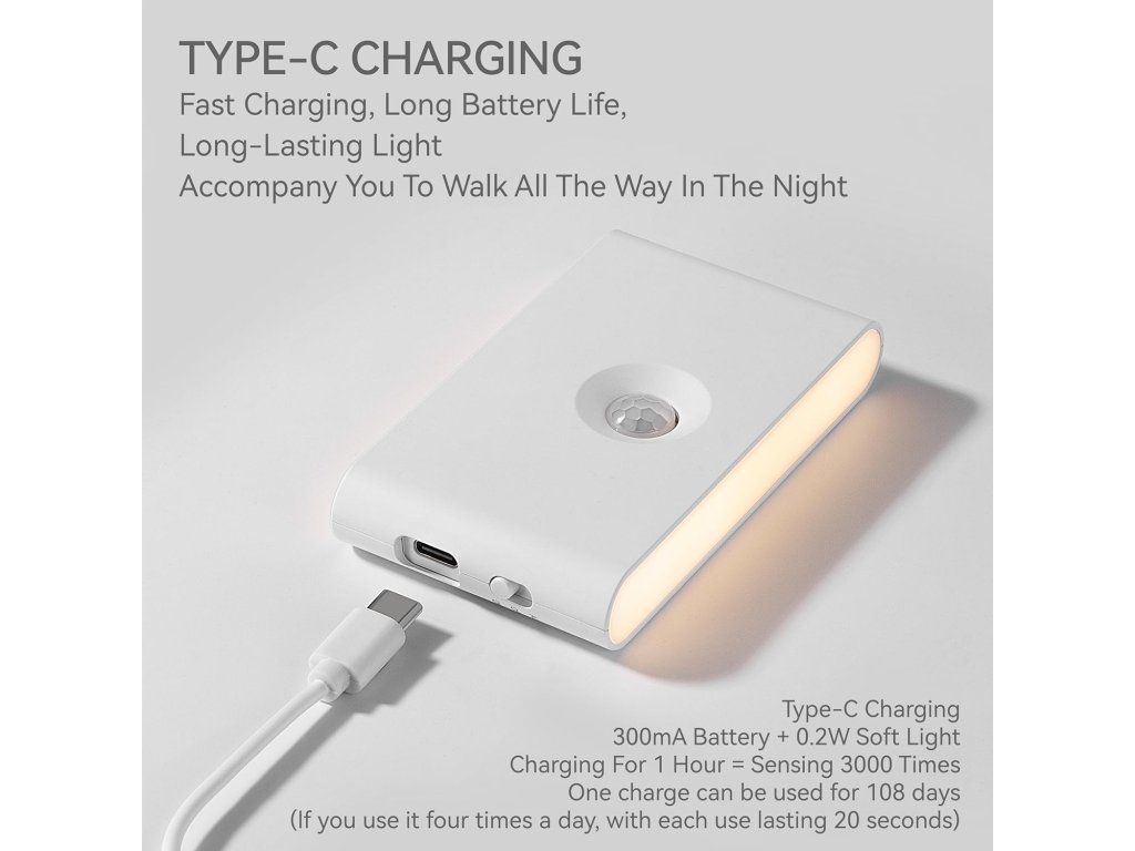 3. Velká baterie s kapacitou 1000 mAh, v režimu senzoru může svítit 3-4 měsíce (v režimu senzoru svítí každých 20 sekund), v režimu konstantního světla svítí 40 hodin
