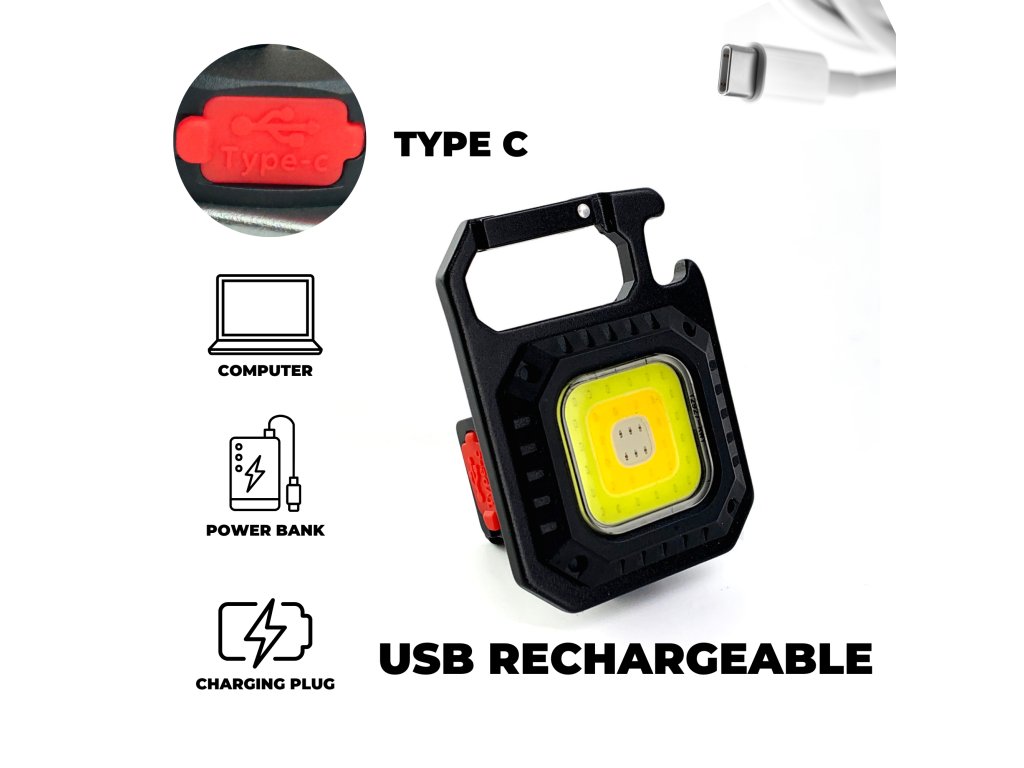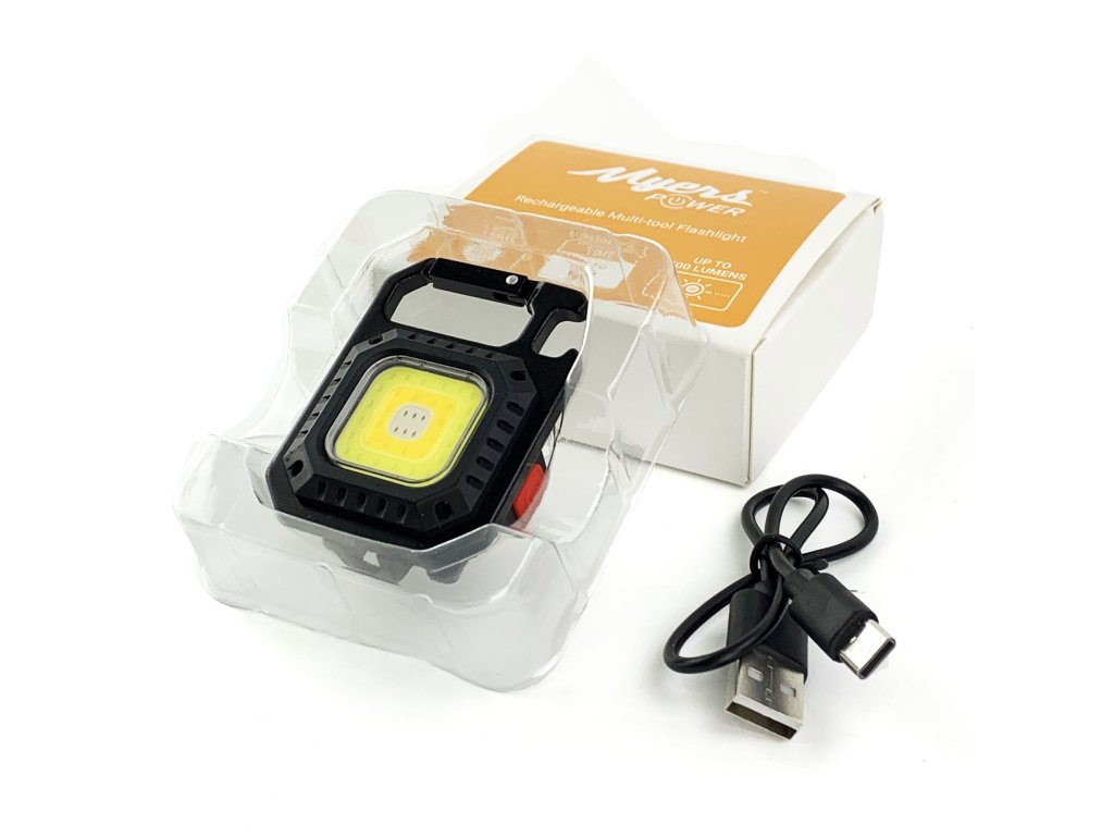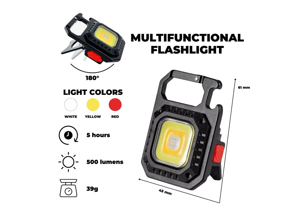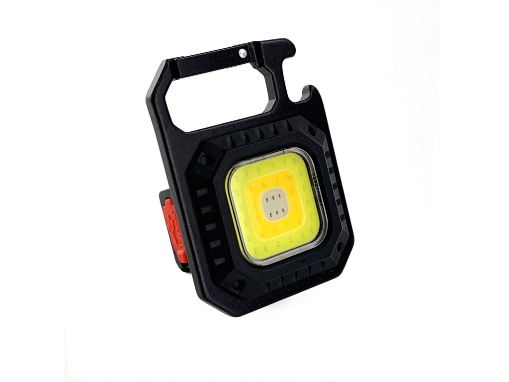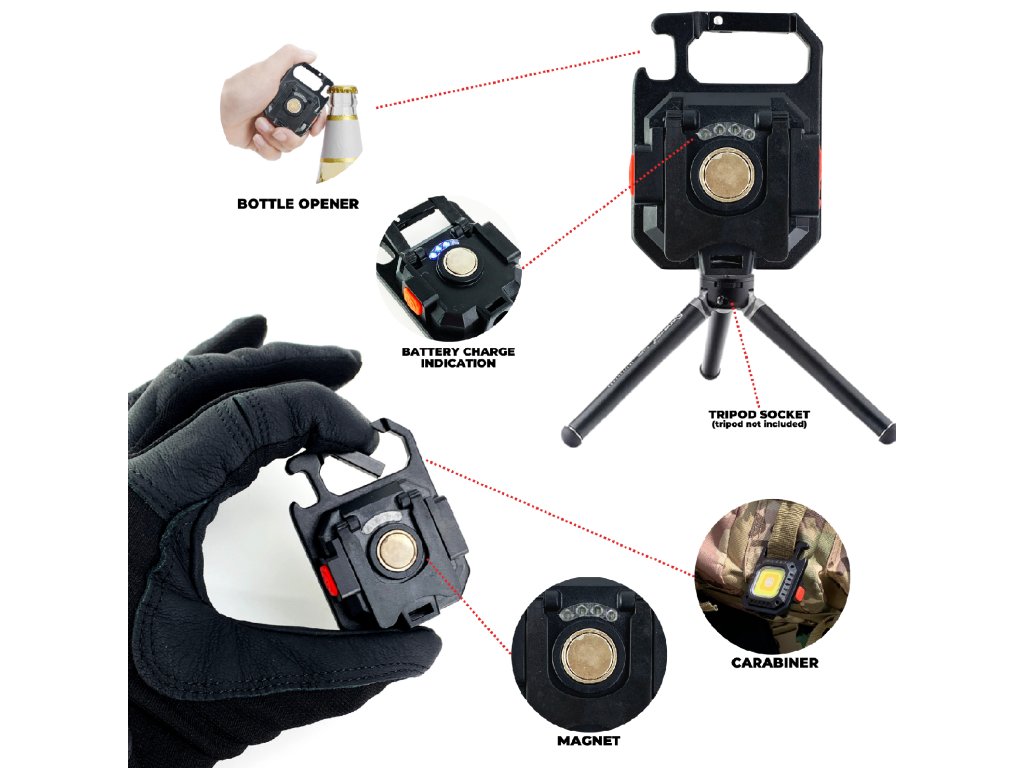 LED svítilna na klíčenku TGL-223 Malá LED svítilna vám pomůže v jakékoliv situaci. Je vybavena karabinkou, otvírákem na plechovky, vestavěným magnetem, 180° nastavitelným stojanem a závitovým otvorem pro stativ, což umožňuje mnoho možností montáže. LED svítilna nebude ovlivněna stříkající vodou, pokud ji používáte za deštivého počasí. Vestavěná baterie poskytuje až 5 hodin provozu bez nutnosti nabíjení.