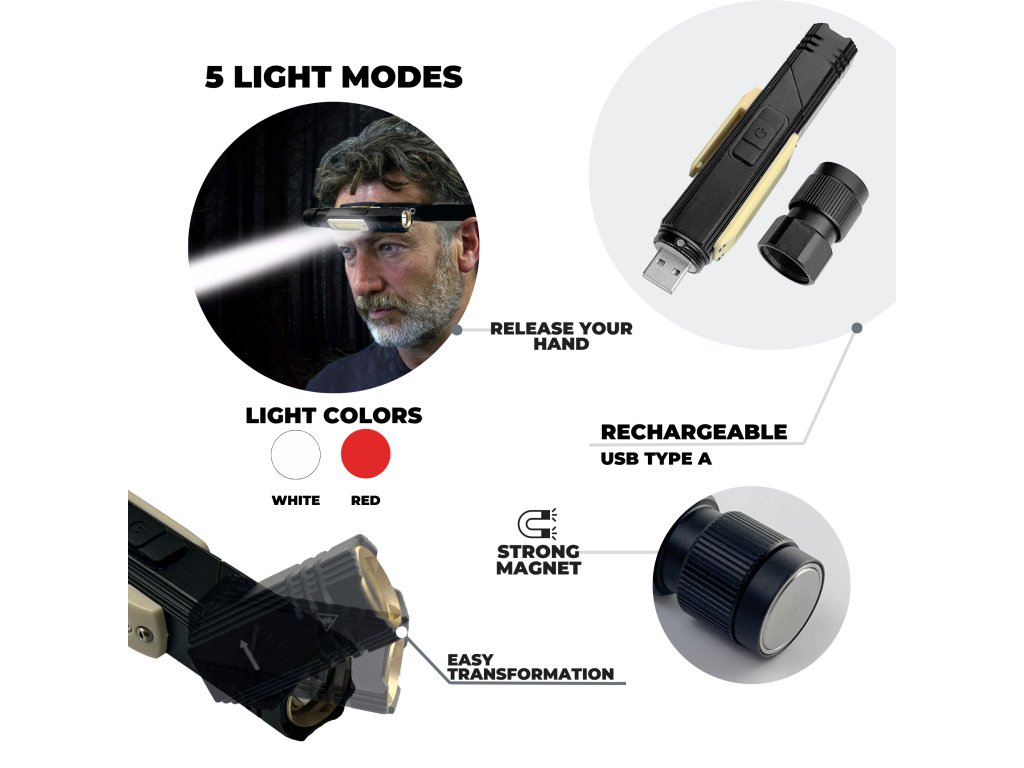 Režimy osvetlenia: XPG silné svetlo + XPG slabé svetlo + COB biele svetlo + COB červené svetlo + COB červené blesk ks batéria 14500 (800 mAh, 3,7 V)