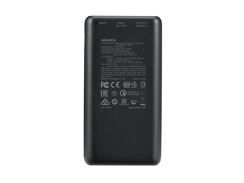 Špecifikácia: Kapacita: 20 000 mAh (74 Wh) Batéria: Nabíjacia Li-polymérová batéria Rozmery (D x Š x V): 134 x 70,3 x 27 mm / 5,3 365 g/12,9 oz Vstup: UBS-C: DC 5 V/3 A, 9 V/2 A, 18 W max. Micro USB: 5 V/2A DC, 10 W max. Výstup: USB-A 1: DC 5 V/3 A, 9 V/2 A, 12 V/1,5 A, 18 W max. USB-A 2: DC 5 V/3 A, 15 W max. USB-C: DC 5 V/3 A, 9 V/2 A, 12 V/1,5 A, 18 W max. USB-C + USB-A 1+2: DC 5 V/3 A, 15 W max.