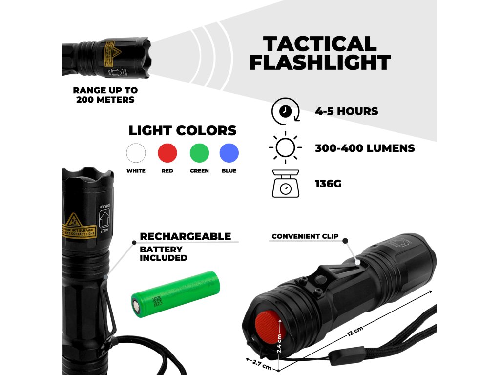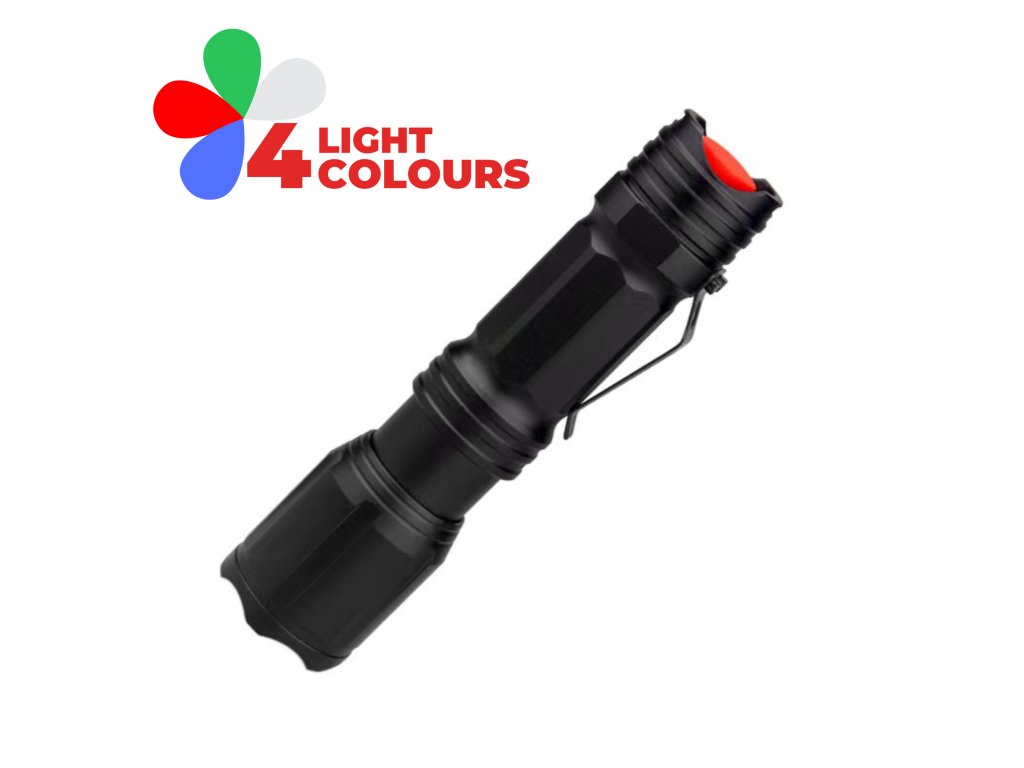Taktické svietidlo TFL-221 so 4 farbami svetla Svietivé svietidlo schopné vysielať červené, zelené, biele a modré svetlo. Má klip pre uchytenie.